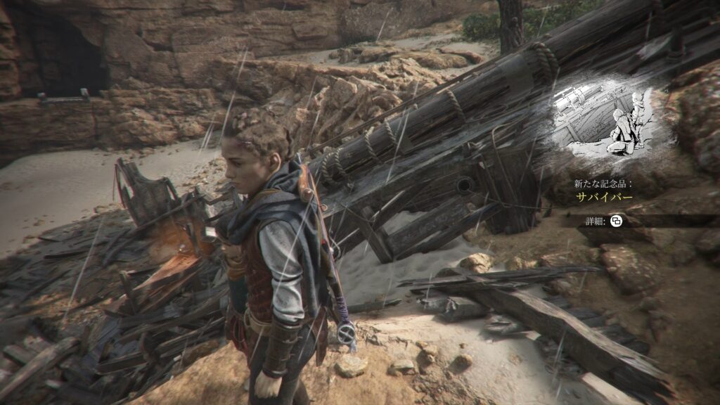 [3-さらに増えるネズミ]ネズミの洞窟を抜けた後、船の残骸があるエリアを少し進んで左手にある崖を上った先にあります。