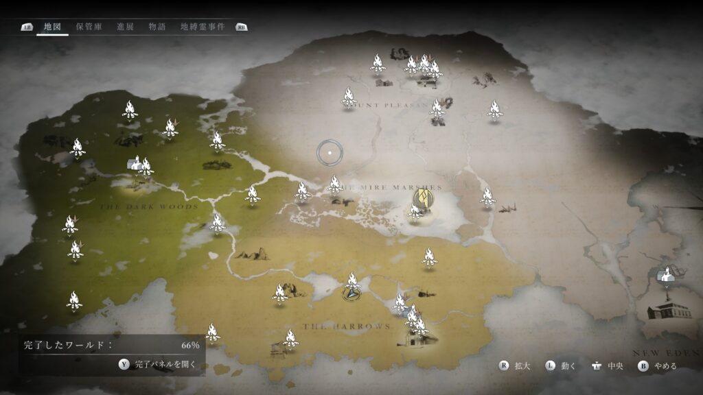 黒い森に10か所、ミーア湿地に4か所、喜び山に7か所、ハロウズに8か所、ニューエデンタウンに1か所(学校)あります。