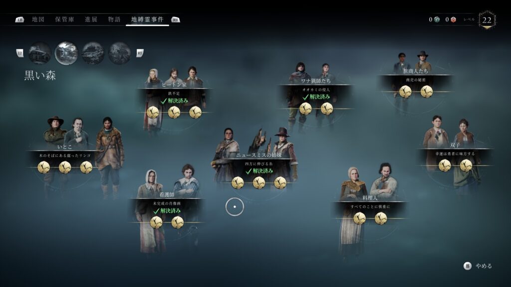 メインクエストを進めると地縛霊事件が解放されていきます。各エリアの地縛霊事件をすべてクリアすると解除されます。