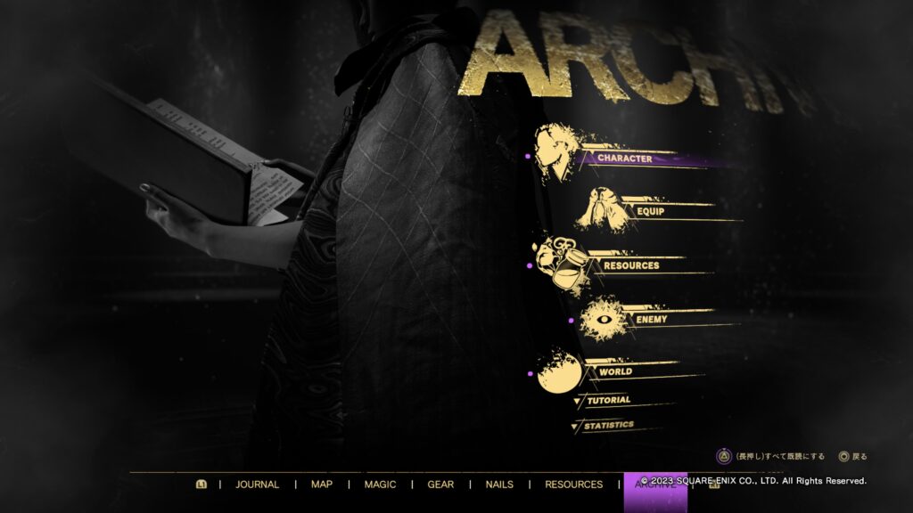 アクションのチュートリアルの一覧から世界観についてのアーカイブ、キャラクター、敵の説明など情報が豊富で、よりアーシアの世界観を楽しめます。