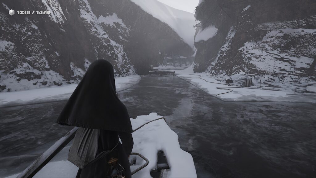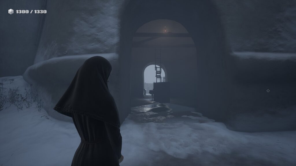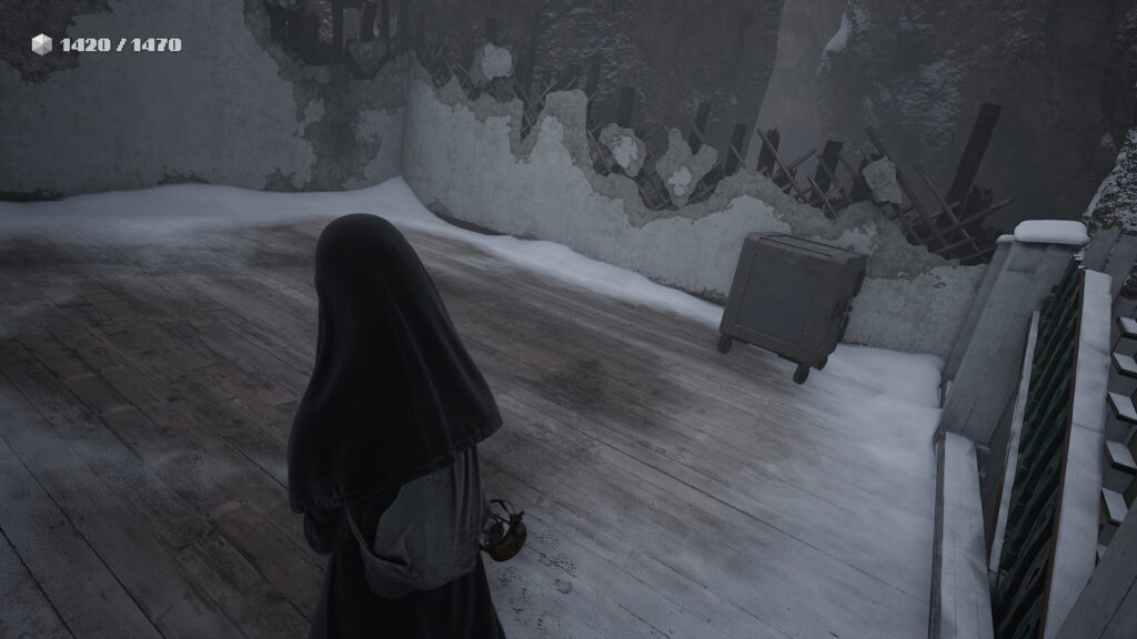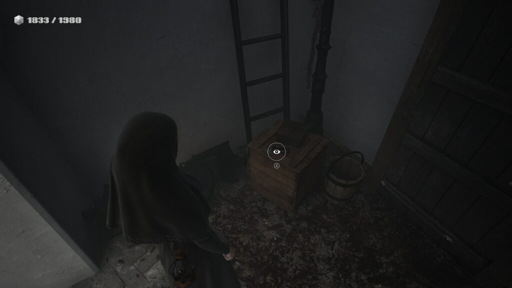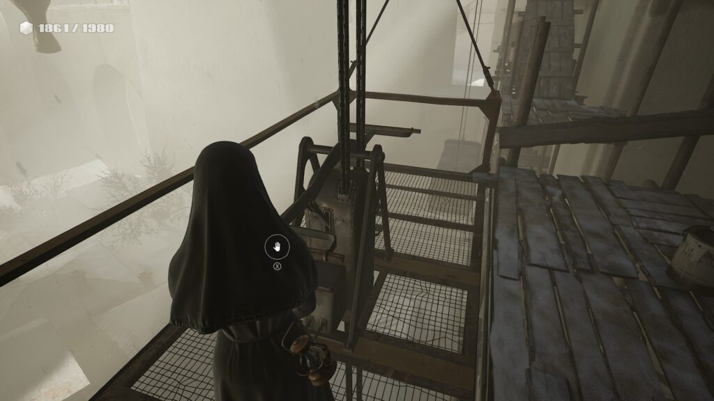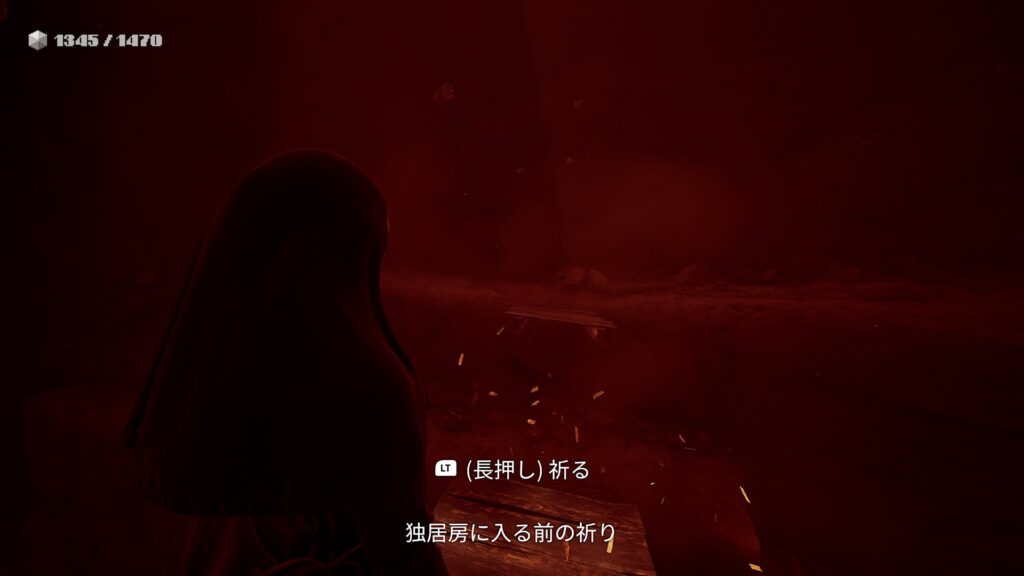 「ティホン」クランクを動かして画面が暗赤色になった後、祈りを使わずに崖を下りて箱と橋を上った先の壊れた橋で祈りを使い橋を渡って進むとリフトの天井を下りた後に解除されます。