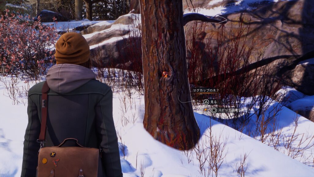 マグカップの写真:「チャプター2:半影 – 高台の調査」で生きている世界の入口に向かわずに、逆に下りていく途中の木にある「マグカップの木?」のスナップ写真を撮る。