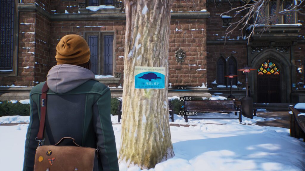 「チャプター2:半影 – 牛の角を掴む」の死んでいる世界のカレドン大学の北中庭で木に刺さっているカモノハシの広告を調べて登録します。