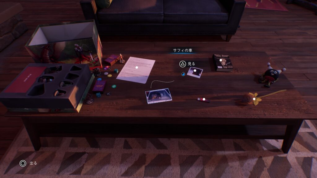 サフィの車:「チャプター2:半影 – 3人のテーブル」でサフィとの会話でサフィの車の写真を見る。