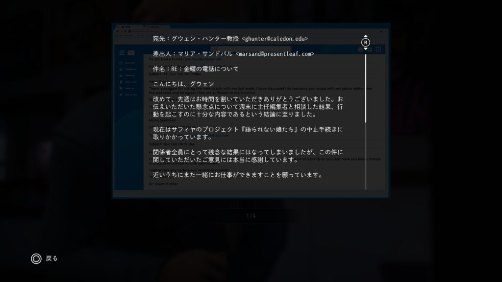グウェンのEメール:「チャプター2:半影 – 牛の角を掴む」でグウェンの執務室でマリアとのEメールを読む。