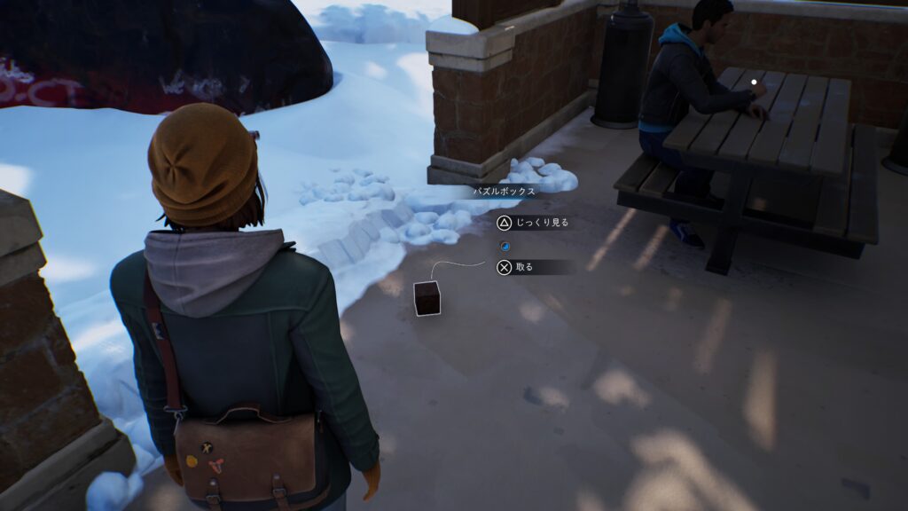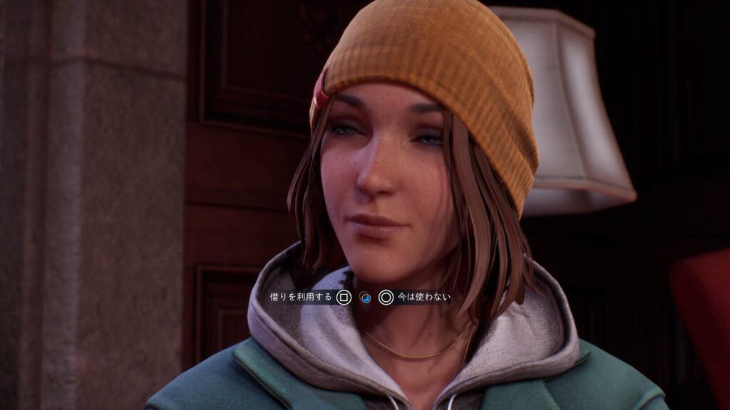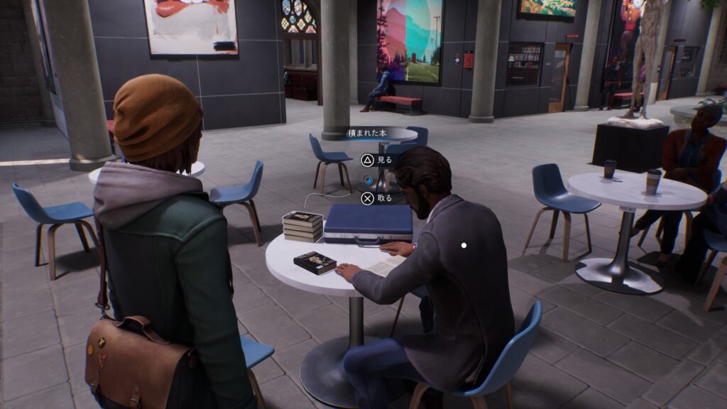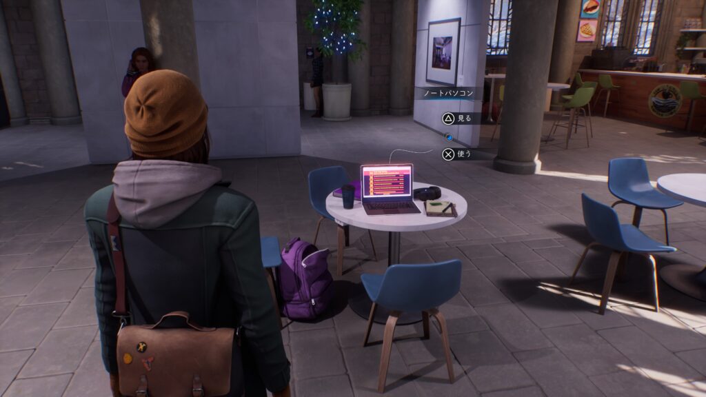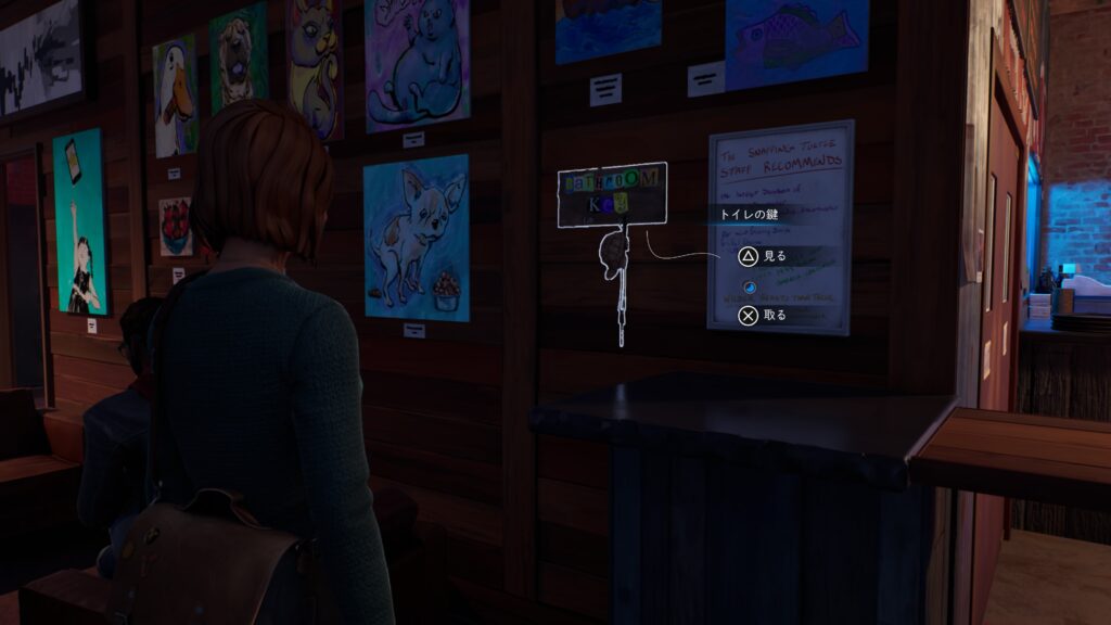その後、死んでいる世界のテラスに移動してマックスの能力「パルス」でおもちゃの銃を持った学生の会話を聞き、カウンター横にかかっているトイレの鍵を取ります。