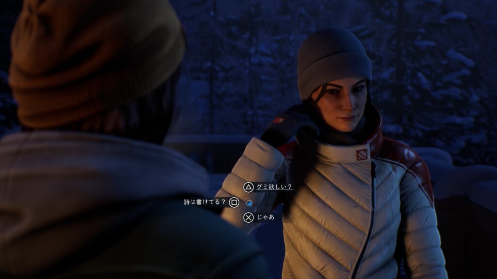 「チャプター2:半影 – 3人のテーブル」でアマンダ、サフィとヤスミンと会話後、生きている世界のテラスにいるおもちゃの銃を持った学生に話す。