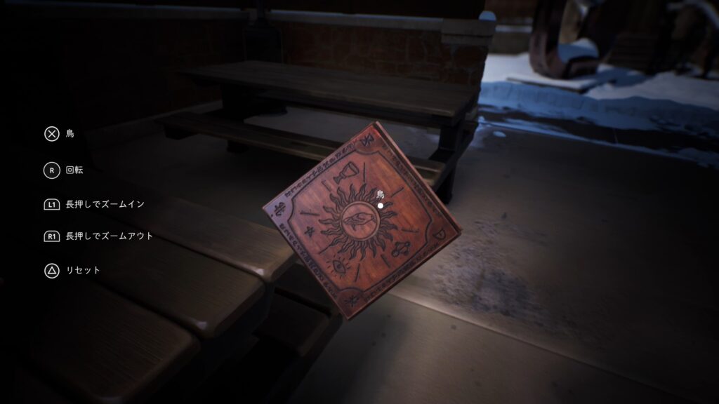 まず、星座を画像の位置にして出てきたダイヤルを取ります。取ったダイヤルをアブラクサスのロゴに置いて画像の位置に動かすと箱のフタが開きます。フタを取るとバッチが手に入り解除されます。