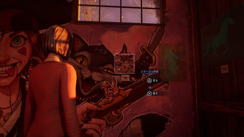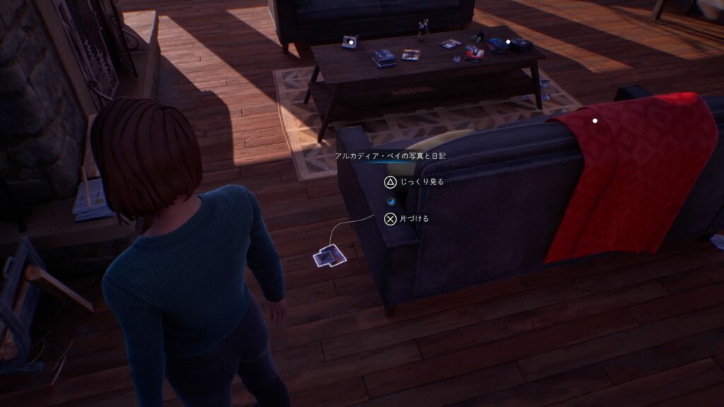 「チャプター1:静物画 – 抜け殻」で思い出箱を片づけてアルカディア・ベイの写真と日記を取り、壁の写真にアルカディア・ベイの写真を貼ります。