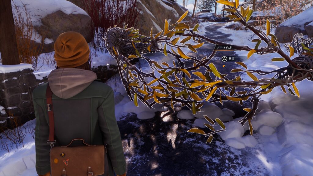 アート作品:「チャプター2:半影 – 高台の調査」で生きている世界の高台への道中にあるアート作品と横の注意書きを読む