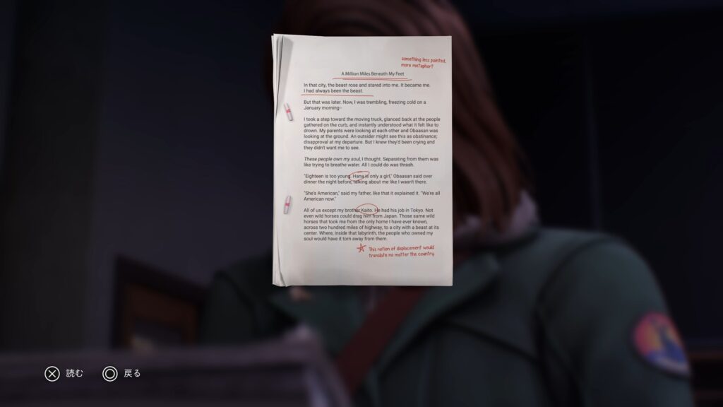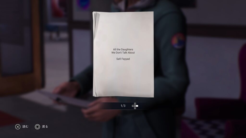 マヤの原稿:「チャプター3:スピン – 詩は語る」でルーカスの執務室で原稿を読む。