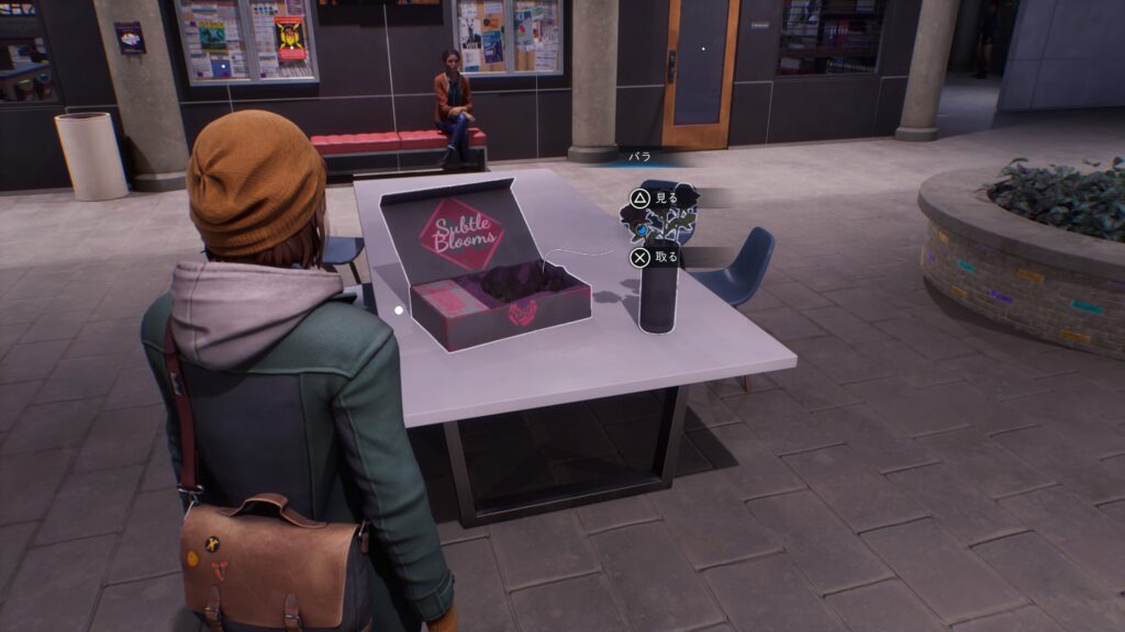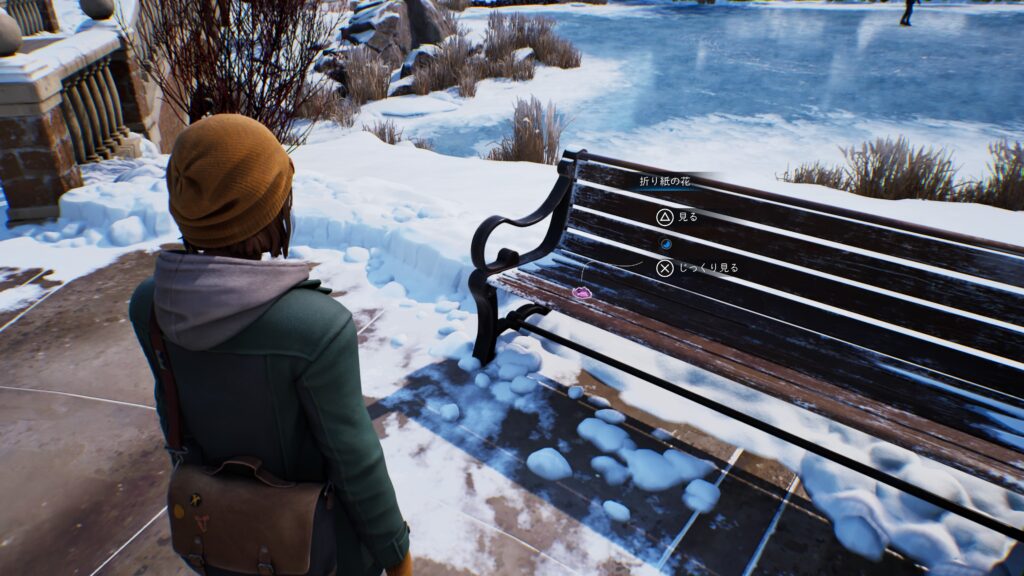「チャプター1:静物画 – 憂鬱のキャンパス」でカレドンの像の前にあるベンチの上にある折り紙の花を2回開いてマックスのコメントを聞く。