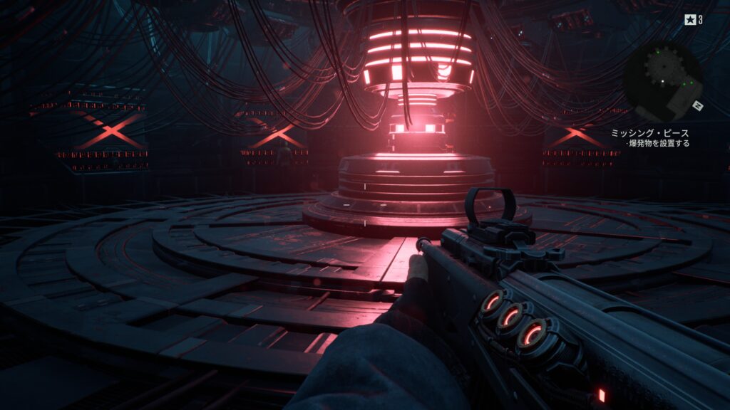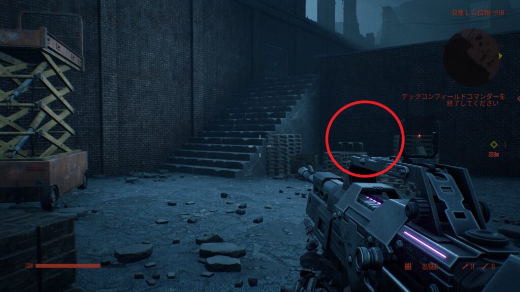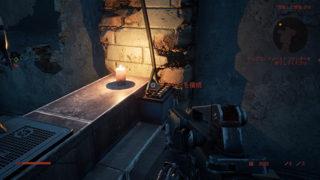 開始位置から北に進んで行った左手の建物。カウンターにバッテリーがあるので「ワイヤーを接続」インタラクトすると秘密が解除されます。