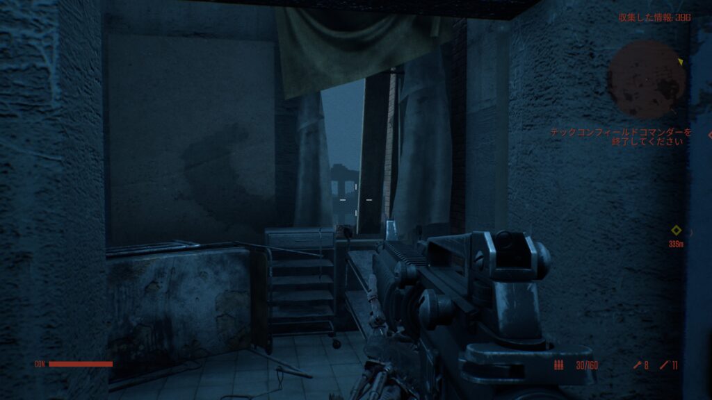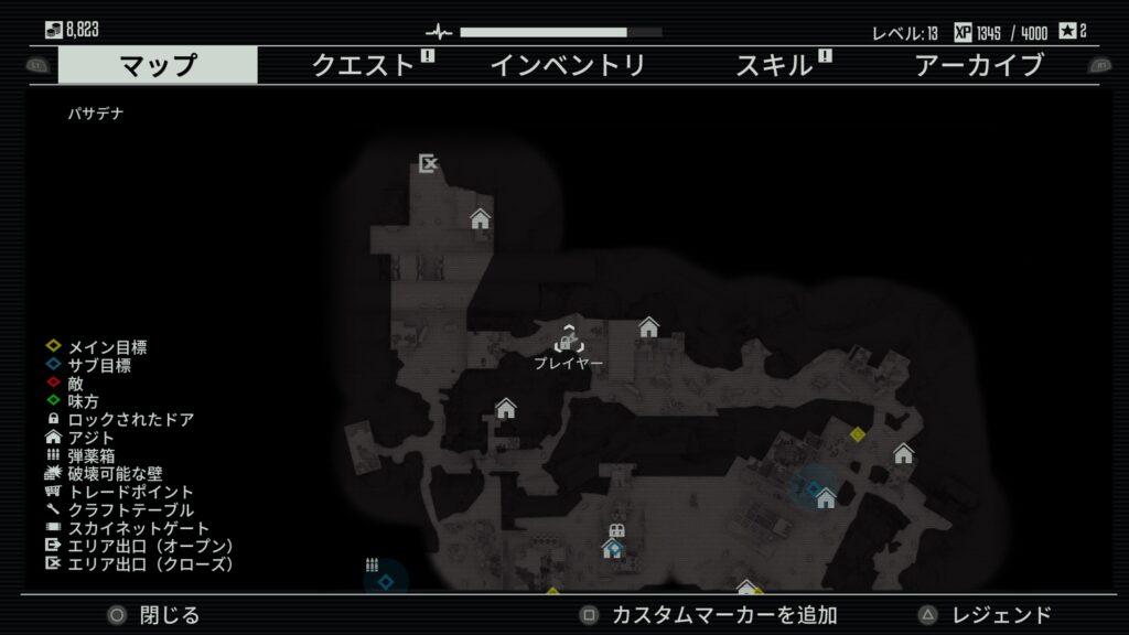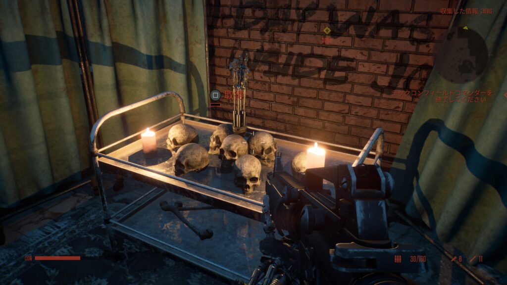 開始位置から北東に進んだ先の病院の建物。階段を上がって2階に行き、開いている窓から外に出て違う窓が開いているので中に入った先にあるターミネーターの腕を取得すると秘密が解除されます。
