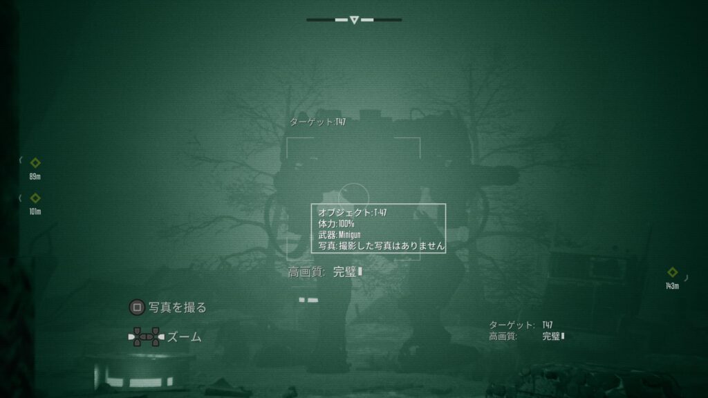 抵抗軍のシェルター到着後のバイザーのアップルグレード後に写真が撮れるようになります。「グッド」以上の写真を撮ると解除されます。