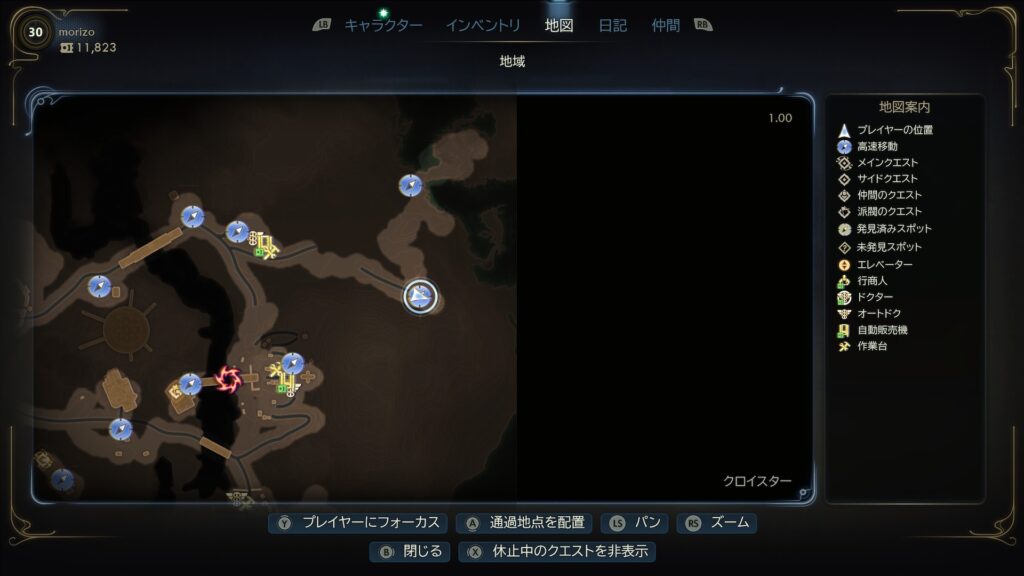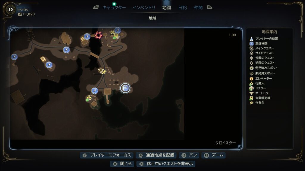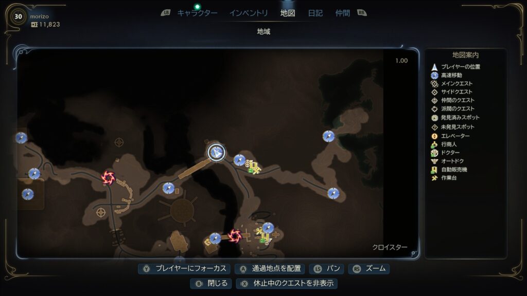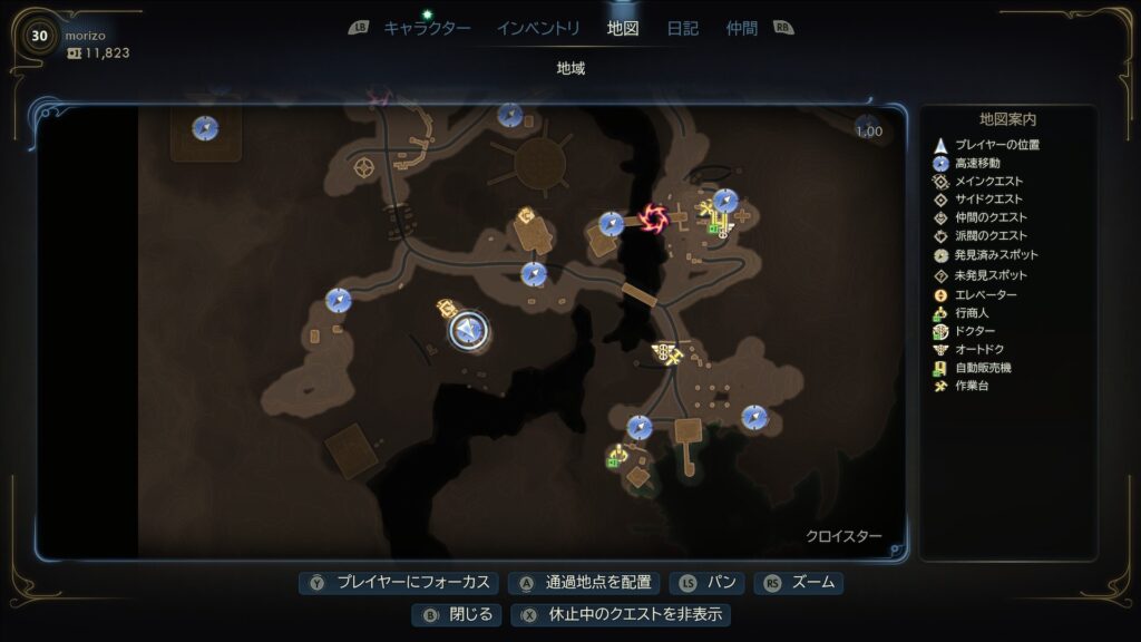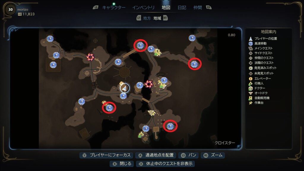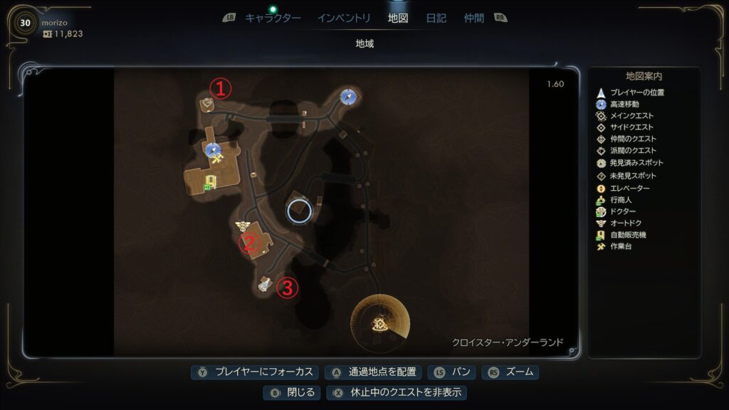 クロイスター・アンダーランドの①の場所で受注できるクエスト「大空への帰路」を進めることで熟慮教会近くへ出ることができるリフトを開放できます。
